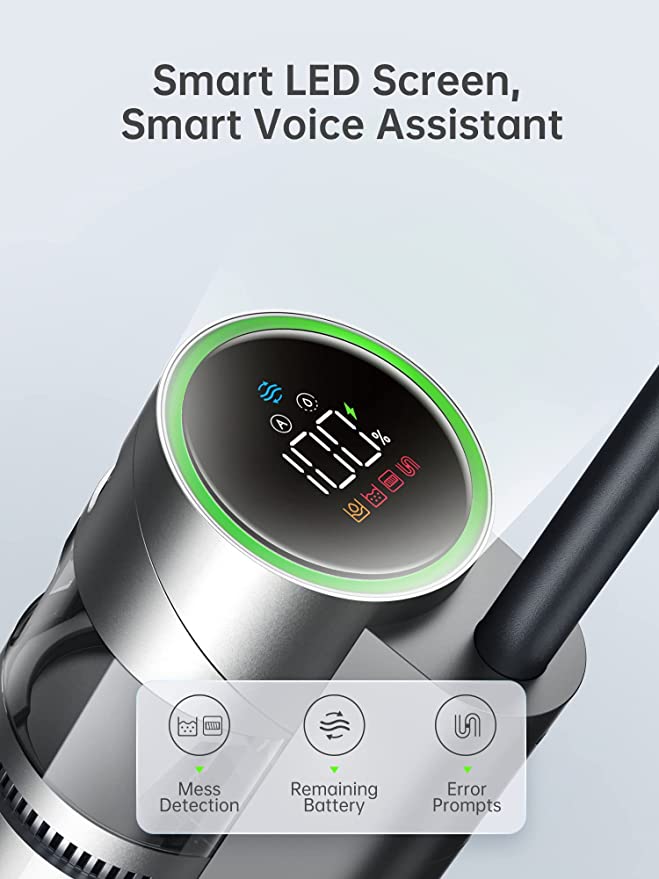 - Pantalla LED y Aviso de Voz Inteligente : La pantalla digital de la aspiradora Dreame H11Max aspiradora escoba sin cable y las útiles indicaciones de voz proporcionan toda la información que necesita para ayudarle. Los indicadores intuitivos de batería, potencia de succión, autolimpieza, obstrucciones y más le permiten conocer el estado de limpieza de un vistazo.